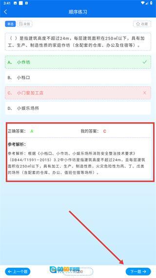 4、提交答案后,查看【正确答案】与【参考解析】,理清对应的知识点,接着点击【下一题】继续进行练习。