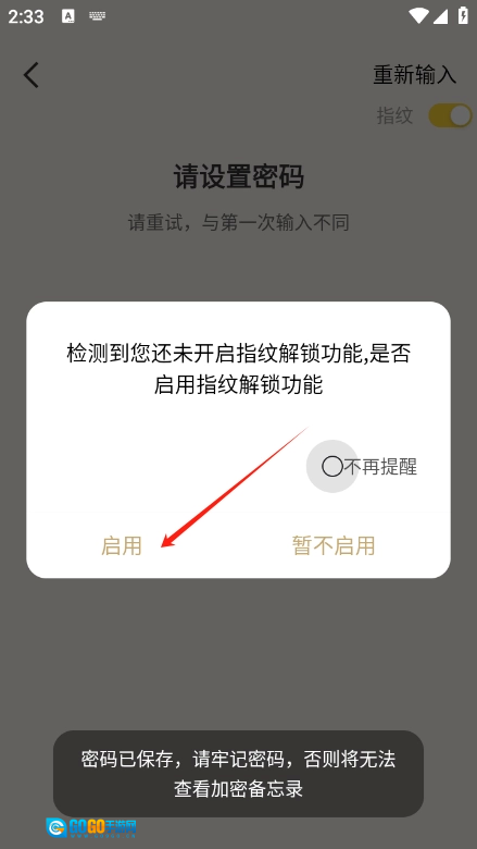 输入完成后点击确认,随后系统会询问是否开启指纹解锁功能,用户可依据自身需求做出选择。