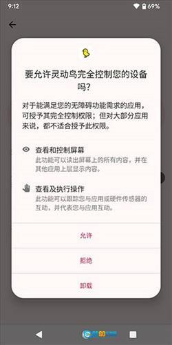 2、为防止弹窗信息被状态栏遮挡,请点击下方的“无障碍未开启”按钮,跳转至无障碍设置页面,并授予灵动鸟无障碍权限。