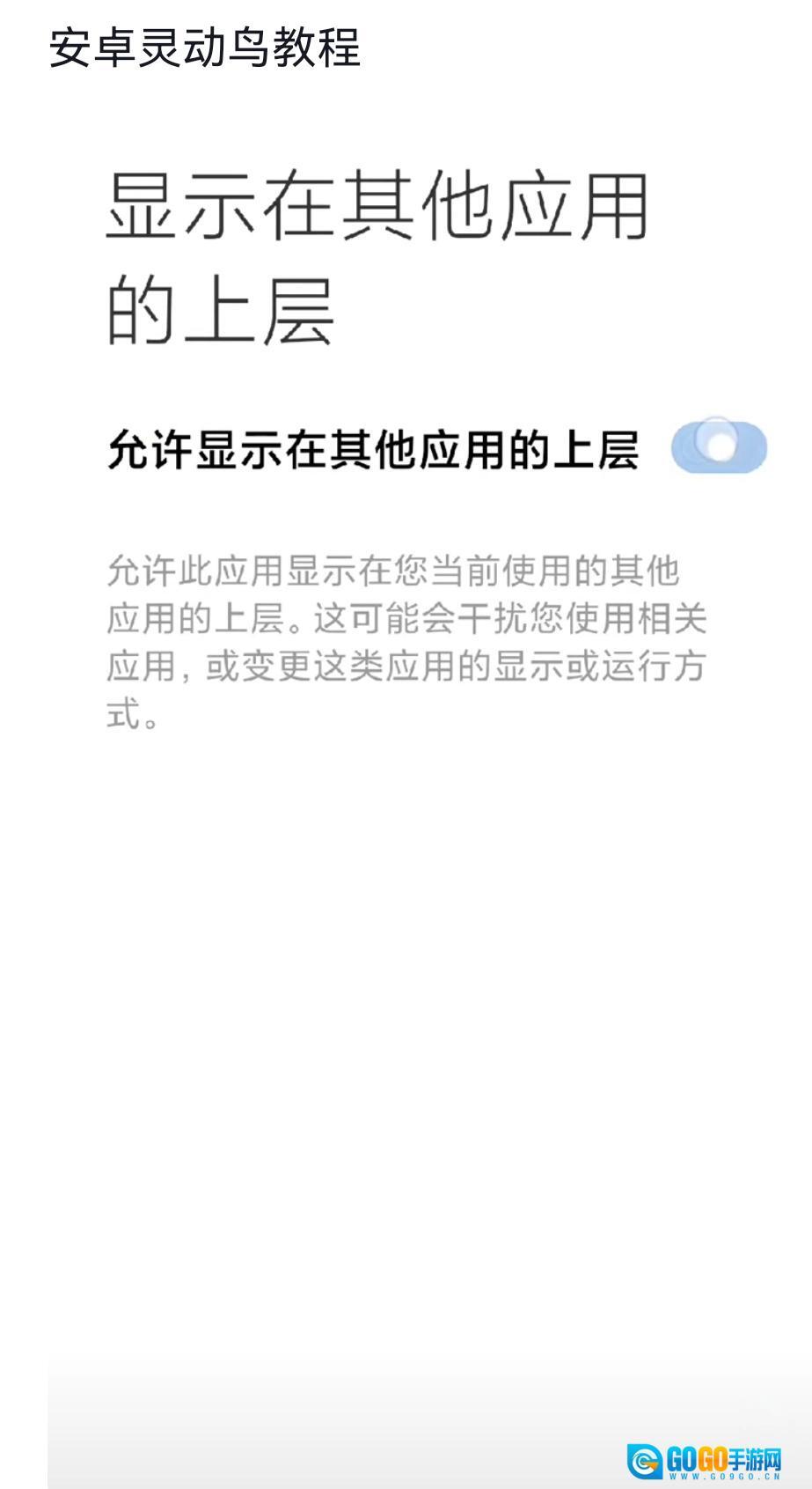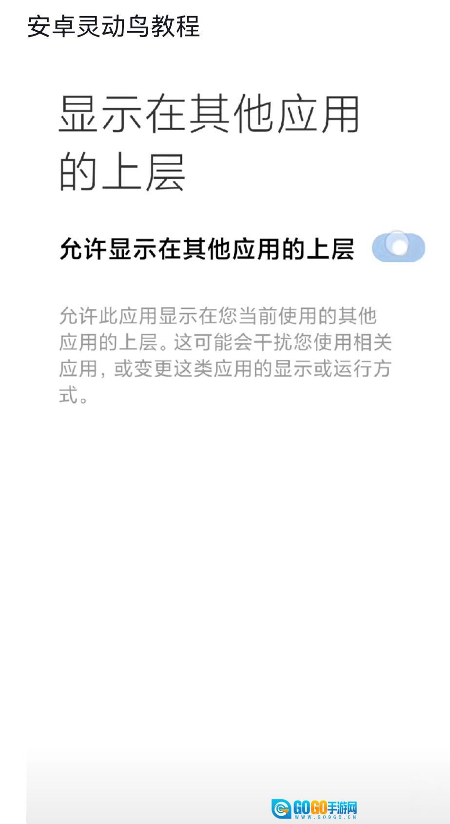 1、进入主界面后,根据提示授予灵动鸟悬浮窗权限,同时允许它在其他应用上方显示。