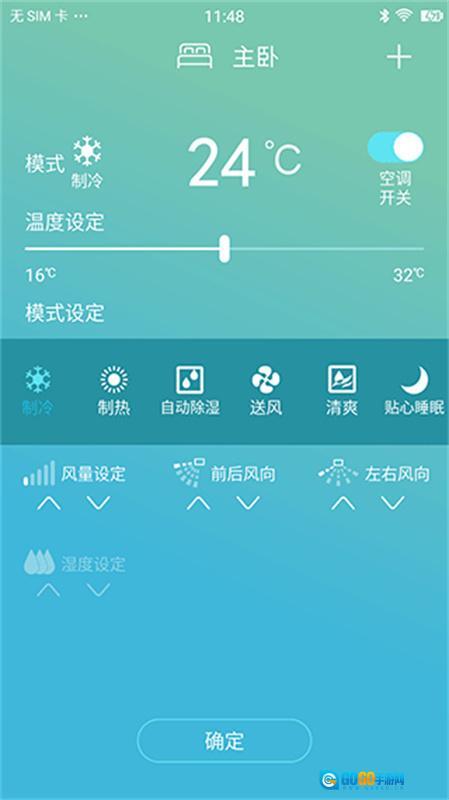 3、空调遥控界面可实现对空调开关、温度、模式、风速及风向等功能的控制。