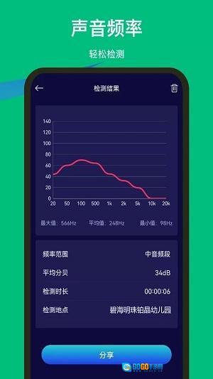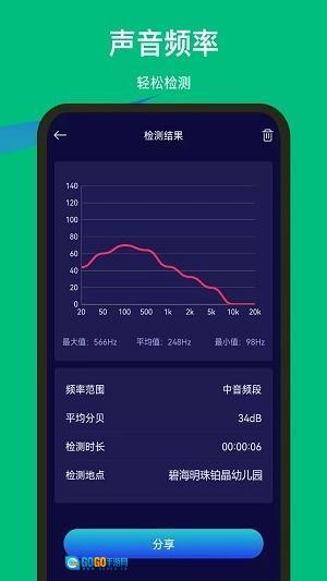 2、频率检测:采用独家算法测试声音频率,可一次性呈现频率与分贝结果,助力保护听觉、远离声音污染。