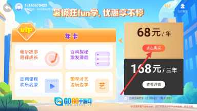 4、在购买页面选择【68元/年】的套餐,然后点击【点击购买】按钮完成支付操作。