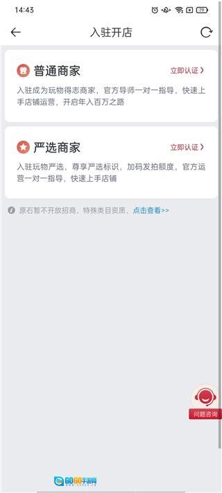 2、点击右下角的“我的”,找到“商家入驻”选项;接着选择你要开设的是普通商家还是严选商家,然后点击“立即认证”按钮。