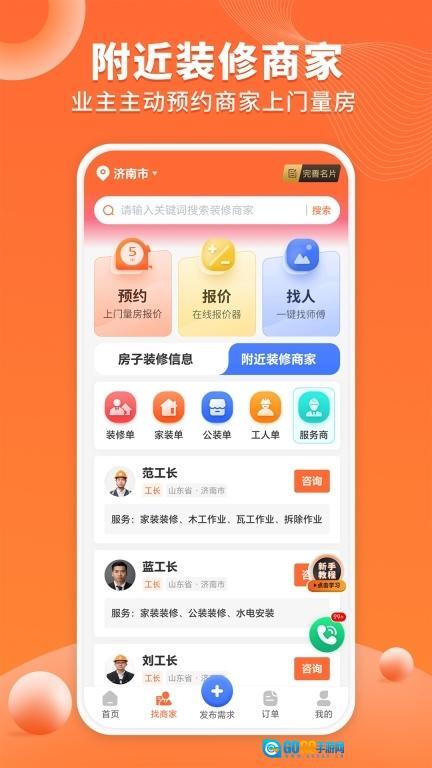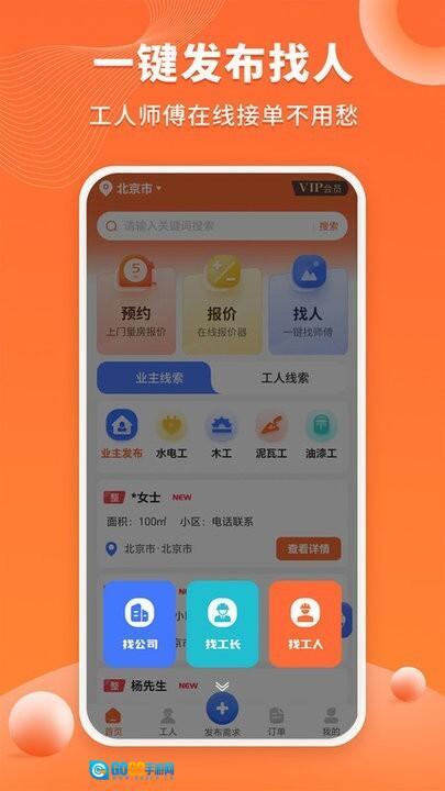 工长接单宝是一款专门为装修工人设计的接单辅助工具软件,平台上拥有大量的装修订单资源可供用户获取,装修工人能够迅速找到周边同城的装修订单,接单效率更高,极大地提升了找工作的速度。这里的订单涵盖了丰富多样的工种类型,包括水电工、装修工、木工、油漆工等,有求职需求的工人只需一键搜索就能找到合适的订单。每次接单的相关信息都可以随时进行查看,且信息真实可信,有需要的用户赶紧来这里体验吧。