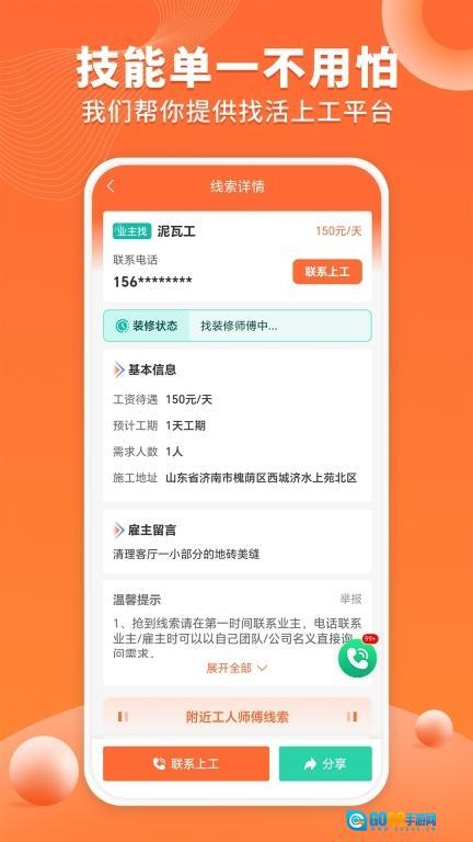 2、工人师傅在线接单毫无压力,每次操作都十分便捷。