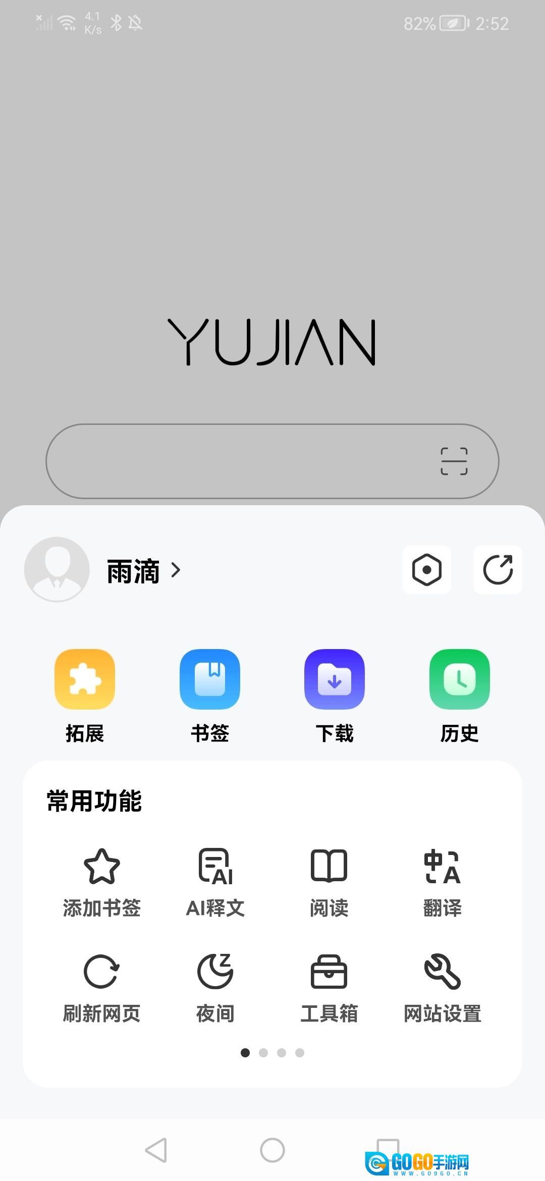 1、打开已有的雨见浏览器,进入主界面后点击底部的功能选项,进入功能菜单。