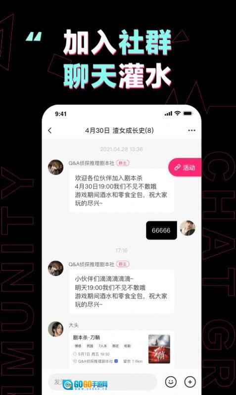 这是一个专为剧本杀爱好者打造的兴趣交流平台。在这里,你能轻松找到同好组队参与各类精彩活动;平台上丰富多样的活动选择,让你随时可以“上车”,和大家一起体验不同的剧本杀乐趣。