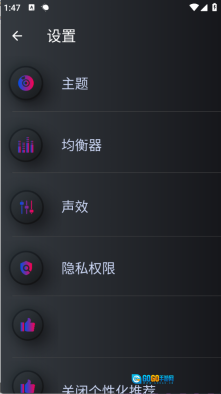 3、点击左上角的按钮,可进行主题、均衡器和声效的选择操作。
