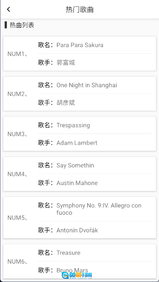 3、还具备热门歌曲在线查看的功能,支持选择不同的歌曲榜单进行浏览。