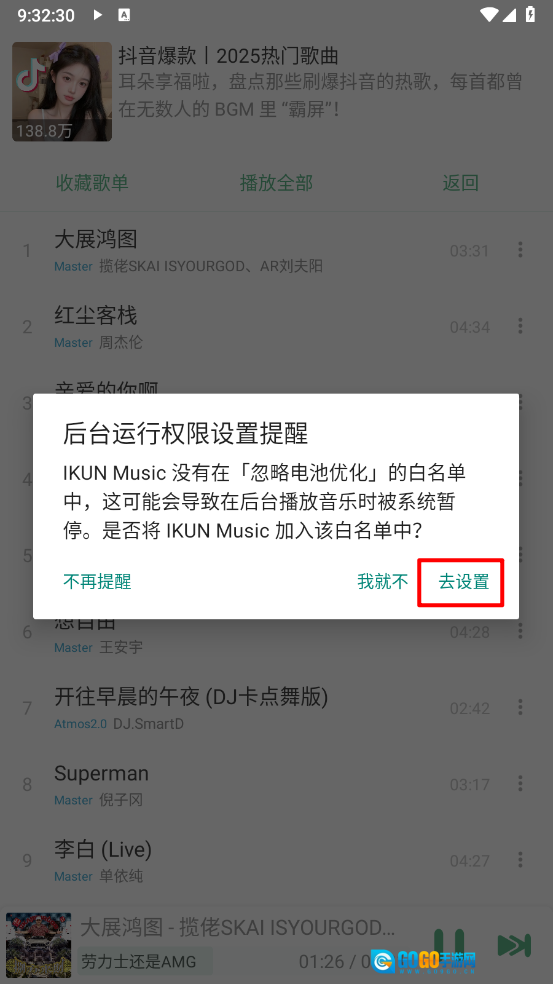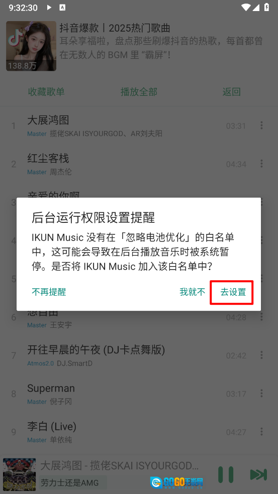 3、随后会弹出运行权限的设置界面,点击“去设置”按钮。