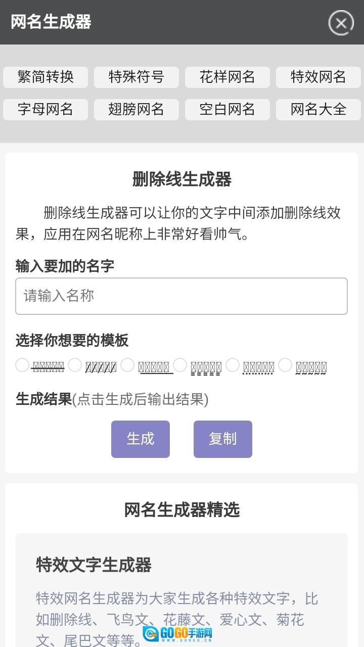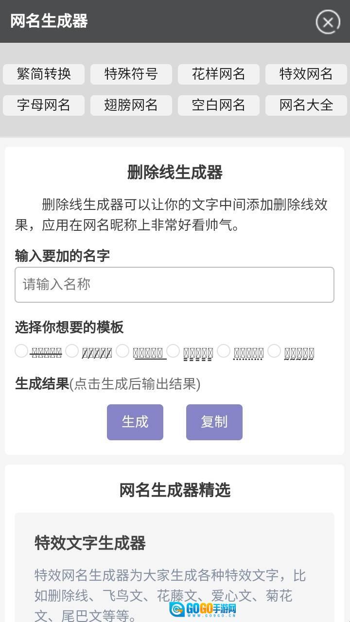 文字删除线生成器是一款实用的工具类软件,核心围绕文字展开多样化功能,涵盖特效文字生成、繁简体文字转换、非主流火星文生成等多种形式的生成系统,助力用户打造独特的网名与文字内容。这款软件占用内存小,操作便捷,仅需一键输入文字,就能轻松生成所需的艺术体文字。