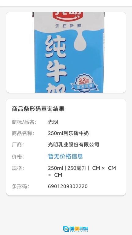 扫描商品条码后,能清晰呈现商品的完整信息,像光明乳业这类知名厂商的产品详情也包含在内,可助力用户迅速知晓商品背景。