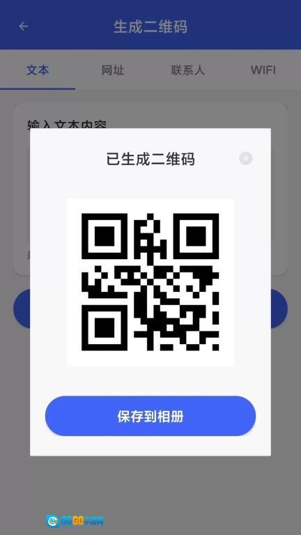 2、支持文本、网址、联系人、WiFi四种生成模式,用户输入相应信息后,系统将自动生成专属二维码,生成完成后可保存至手机相册。