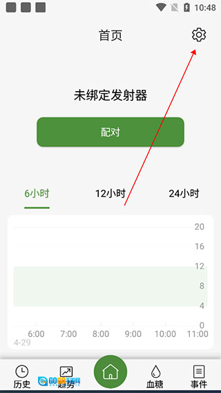 进入首页后,点击页面右上角的“设置”图标,接着在设置选项中选择“发射器”,最后输入SN码或者扫描产品包装上的二维码即可。