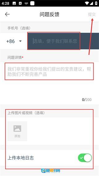 3、进入【问题反馈】页面后,需要把相关信息完整填写好,再点击页面右上角的【提交】按钮,就能提交反馈内容了。