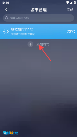 2、点击左上角的【+】图标,进入城市管理界面后,点击【添加城市】按钮。