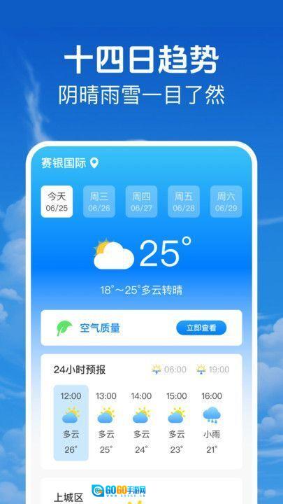 2、多日预报服务,可提供未来15天的天气预测信息,涵盖气温变化趋势与降水概率等内容,有助于用户提前规划行程安排。