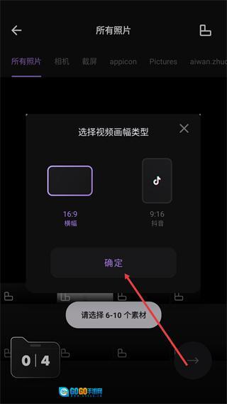 4、进行素材选择时,需先挑选【16:9-横幅】或者【9:16-抖音】的画幅类型,点击【确定】按钮后,再选取6到10个素材来开展制作。