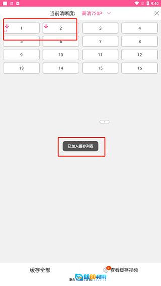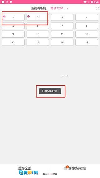 3、进入缓存界面后,先选择想要的缓存清晰度,接着点击需要缓存的剧集集数,即可将其添加至缓存列表。