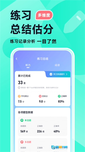 1、一站式雅思备考工具,全套练习及备考技巧。