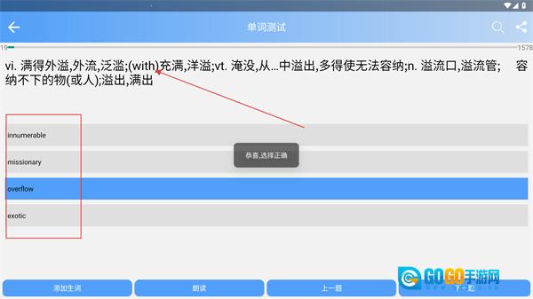 3、完成作答后,可点击【添加生词】【朗读】等功能按钮,对单词进行标记或收听其发音,之后点击【下一题】即可继续进行测试。