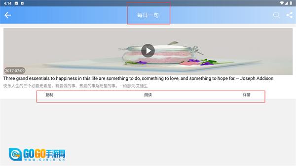 4、进入每日一句页面后,能够查看英文语句及其对应的翻译内容,还可以借助【复制】【朗读】等功能按钮来辅助学习相关内容。