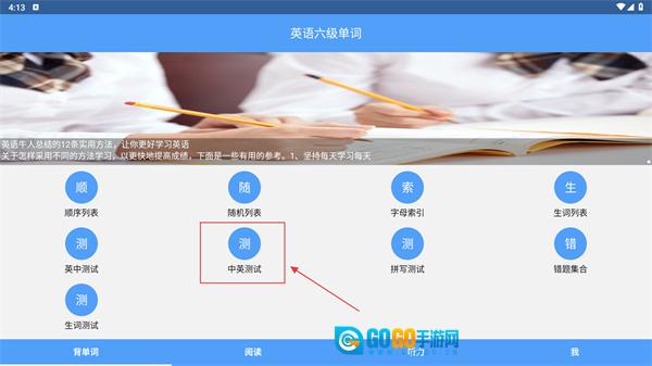 1、打开英语六级单词页面后,找到并点击【中英测试】功能按钮,即可进入单词测试界面。