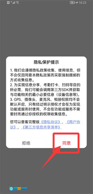 1、在隐私提示页面点击“同意”按钮,以此完成对隐私协议条款的确认。