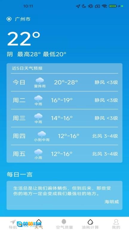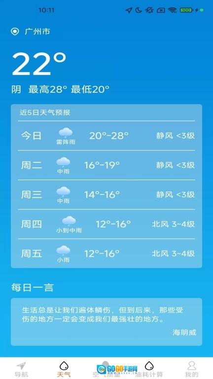 2、天气系统会依据你的定位,展示近期的天气状况,方便用户根据天气安排出行、增减衣物或携带雨具,并且每天都会送上一句不一样的鼓励话语。