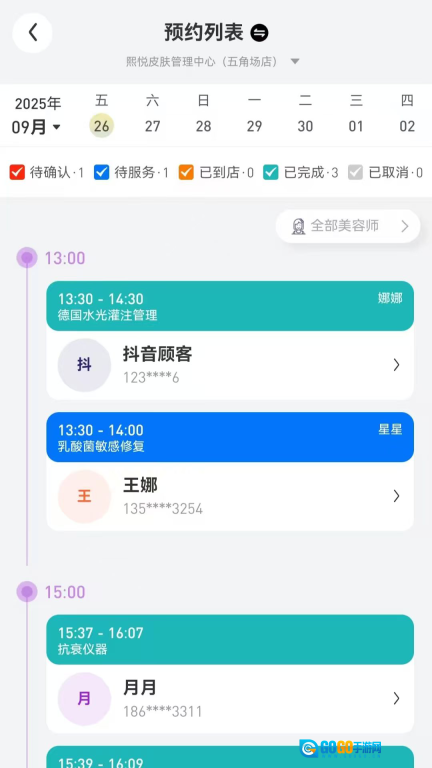 1、可查看预约列表,并能依据时间、状态、美容师等条件筛选预约信息,助力门店高效管理预约业务。