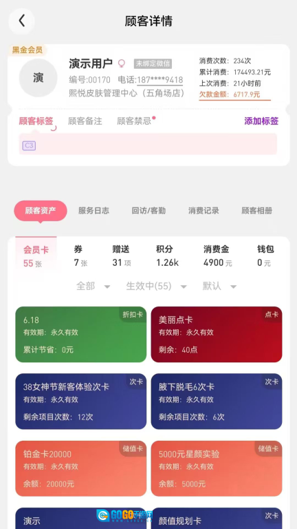 2、对顾客的会员卡、各类券、获赠项目、积分、消费金等资产类信息进行详细记录,还可以标注顾客的相关禁忌。