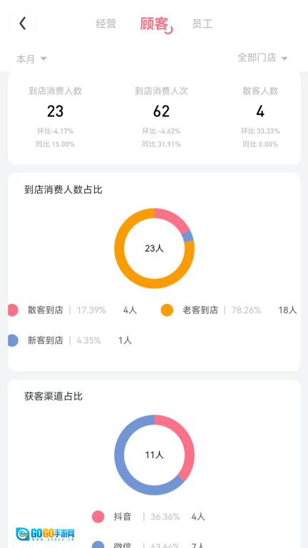 3、对门店营收情况进行实时统计,并借助图表呈现到店消费人数占比、获客渠道占比等相关数据。