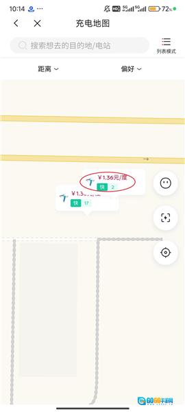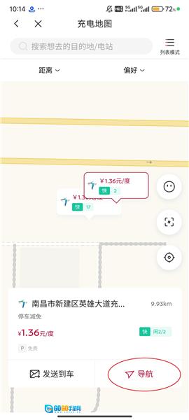 4、在地图上挑选合适的充电站时,能查看每度电的价格,还有空闲的充电桩情况。