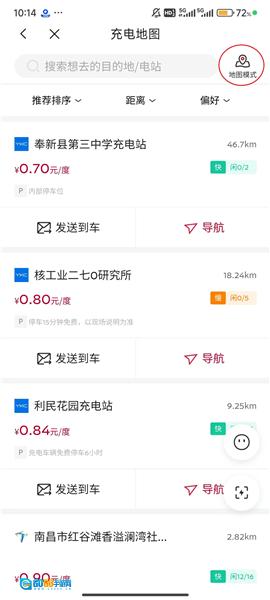 3、能看到周边的充电站,不过显示不够清晰,点击屏幕右上角的“地图模式”即可。