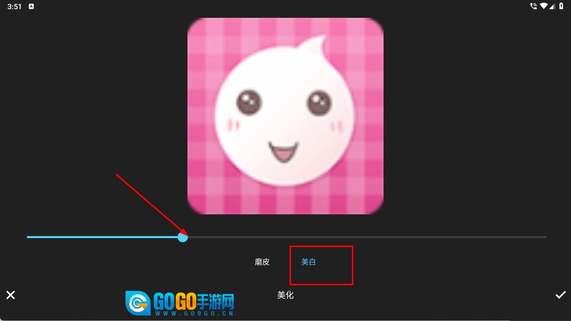 2、进入美化界面后,点击【美白】选项,通过拖动滑块来调整美白的程度,以此优化人像呈现的效果。