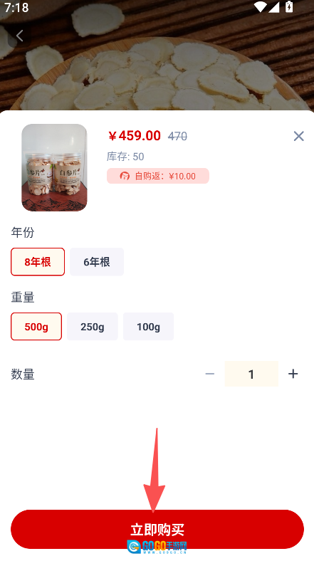 3、商品提供规格选择功能,像人参片可挑选不同年份与重量,购买步骤简单明了,便于用户准确选购到符合心意的规格商品。