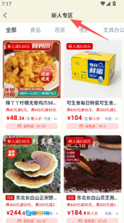 1、进入新人专区,可浏览全部、食品等品类商品。