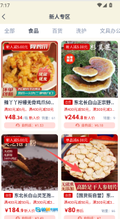 1、商品浏览功能,可在新人专区按品类浏览食品、百货等多类商品,查看商品详情、价格、销量等信息。