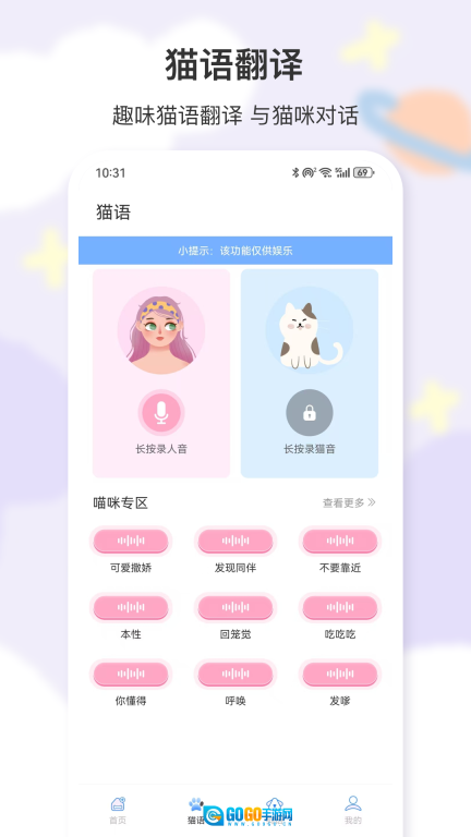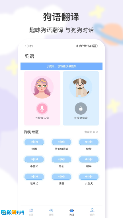 1、《猫语狗语》的界面设计简洁清晰,操作简单方便,就算是不太会用智能手机的用户也能轻松学会使用。