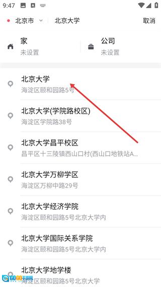 3、从推荐列表里挑选出目标目的地(例如北京大学),接着进入行程确认页面。