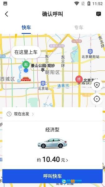4、进入确认呼叫页面后,先核对行程信息以及车型(需为经济型),接着点击【呼叫快车】按钮即可发起用车请求。