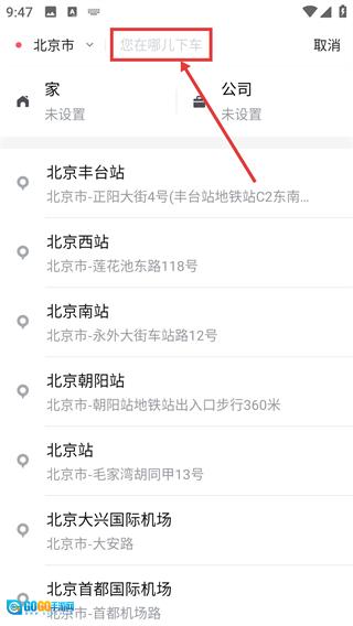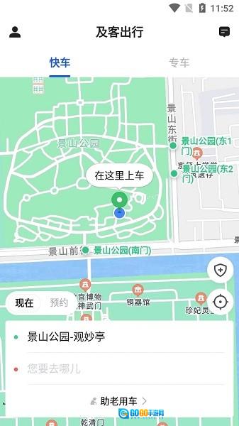 1、打开及客出行APP,在主界面确认好上车点(例如景山公园-观妙亭),接着点击【您要去哪儿】这个输入框,就能进入目的地的填写页面了。