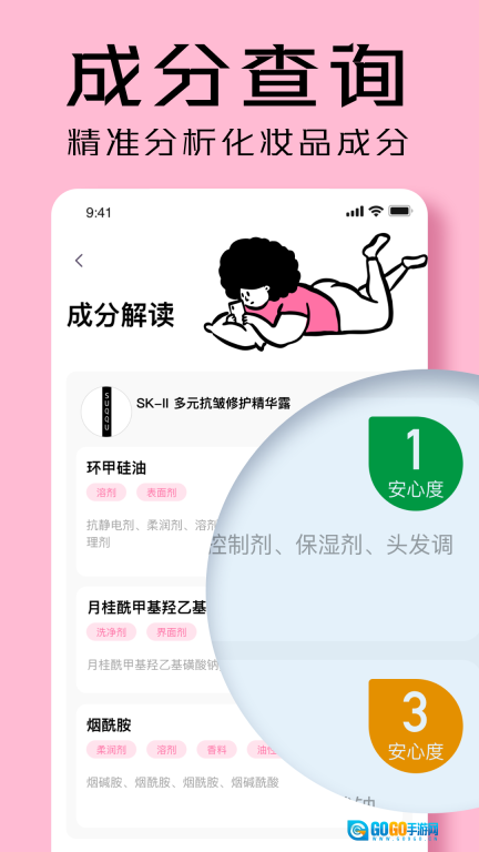 3. 配备了若干实用的化妆品辅助工具,像成分解析与安全等级评定这类功能。