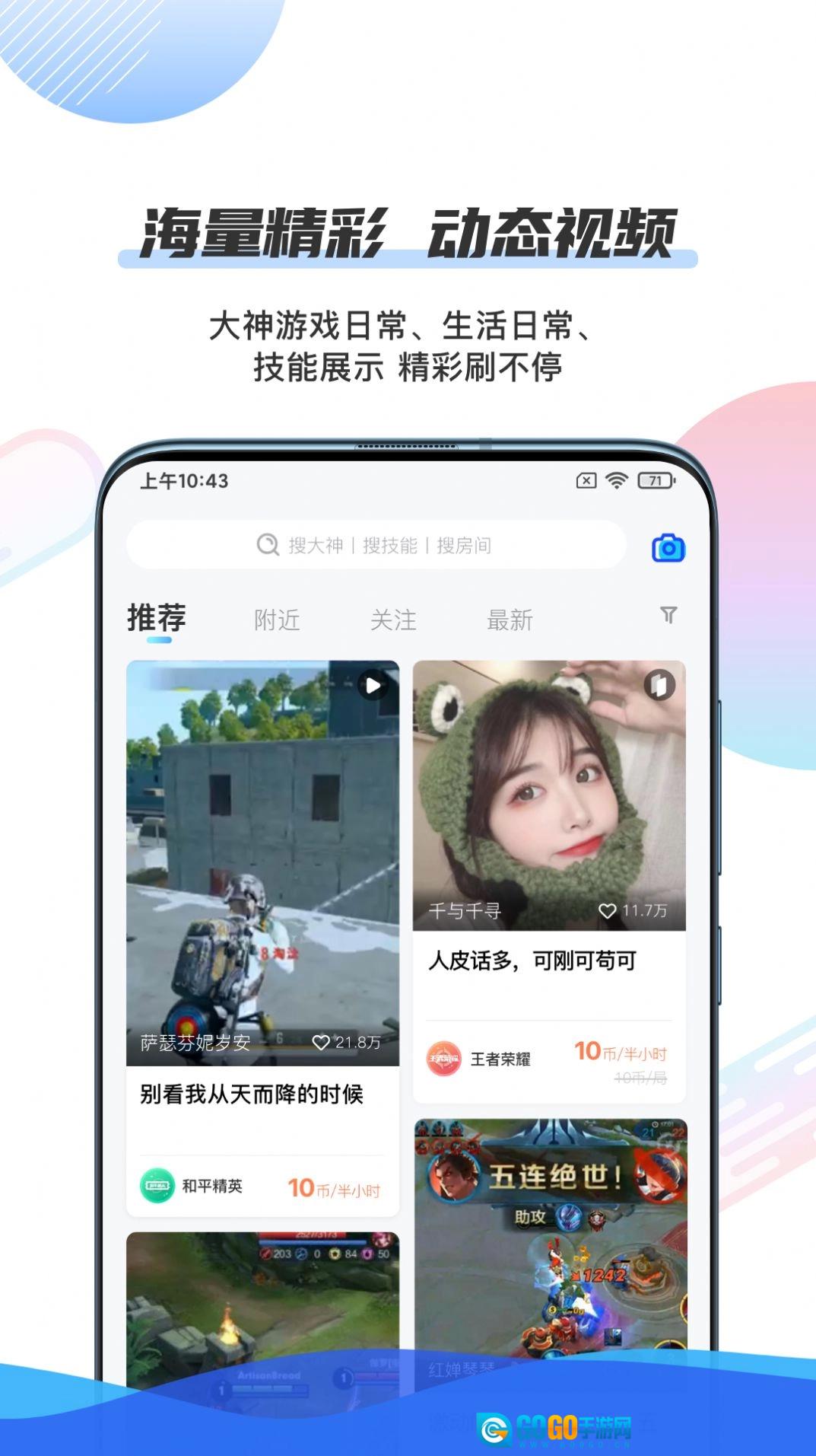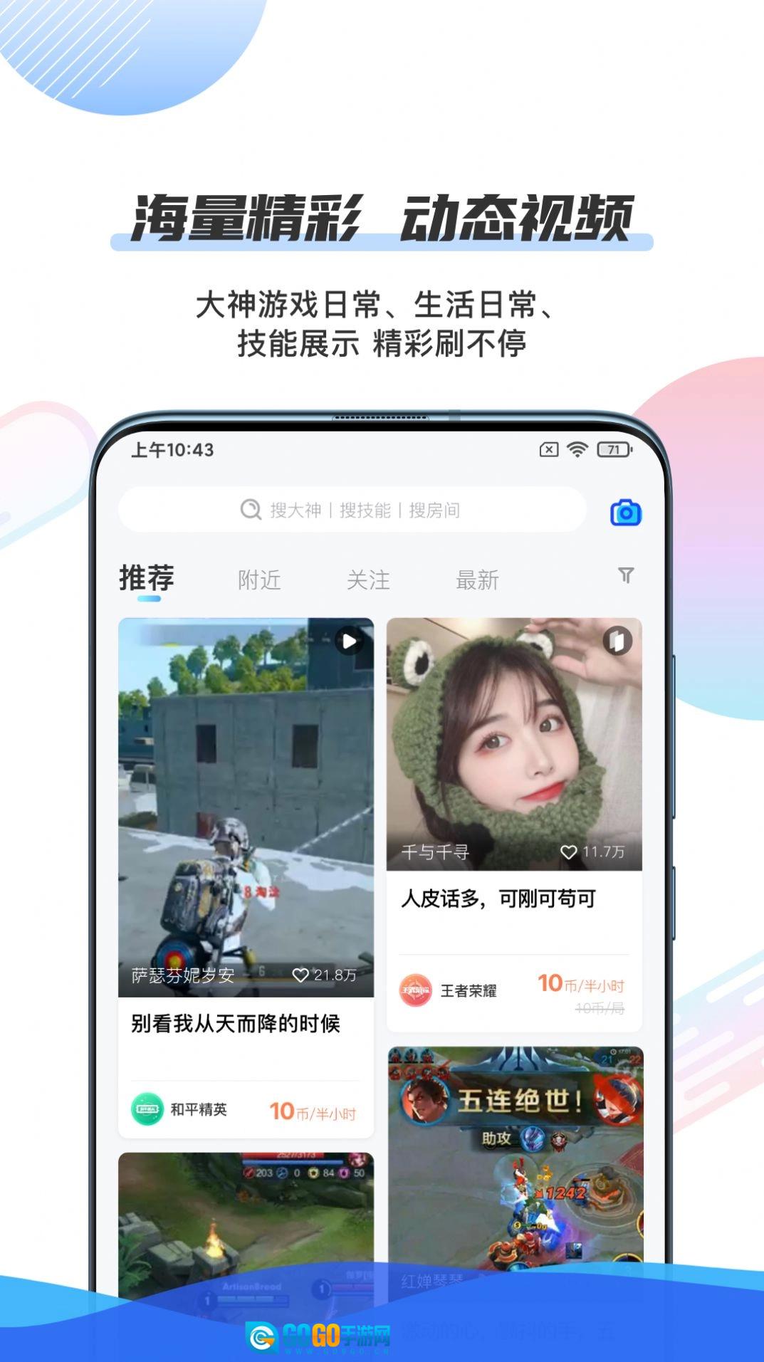 1、现在不少游戏玩家都在用这款社交软件,要是找不到好友组队开黑,就能在这里快速匹配,结识一同玩游戏的伙伴;而且有很多大神用户也入驻了平台,大家可以通过名称或房间号找到大神,让他们带着自己提升游戏段位。