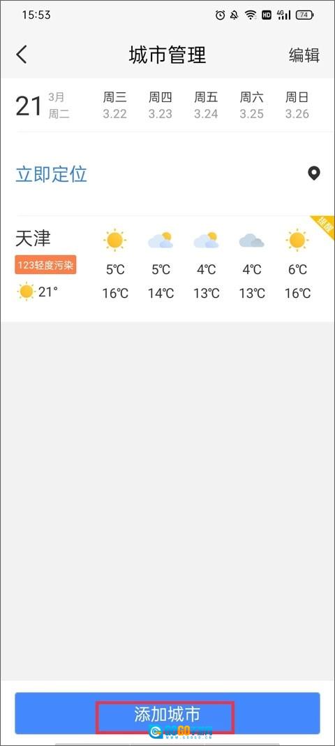 3、城市添加成功后,若需进行排序、删除等操作,可点击右上角的“编辑”按钮进行设置,设置完成后就能查看天气信息。