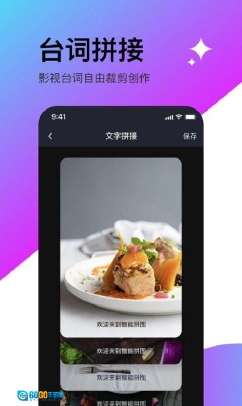 1、台词拼接功能,借助这款能轻松滚动截屏并完成拼图的App,用户可对影视台词进行自由裁剪与创作,还能自行编辑台词内容。