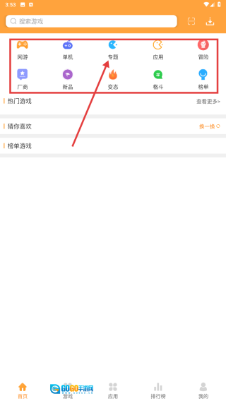 2、在首页上方的分类栏里,点击专题按钮,即可进入游戏应用专题页面。