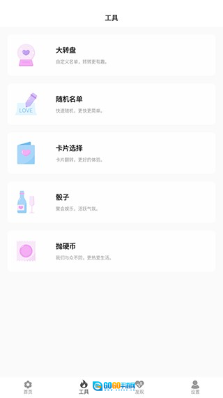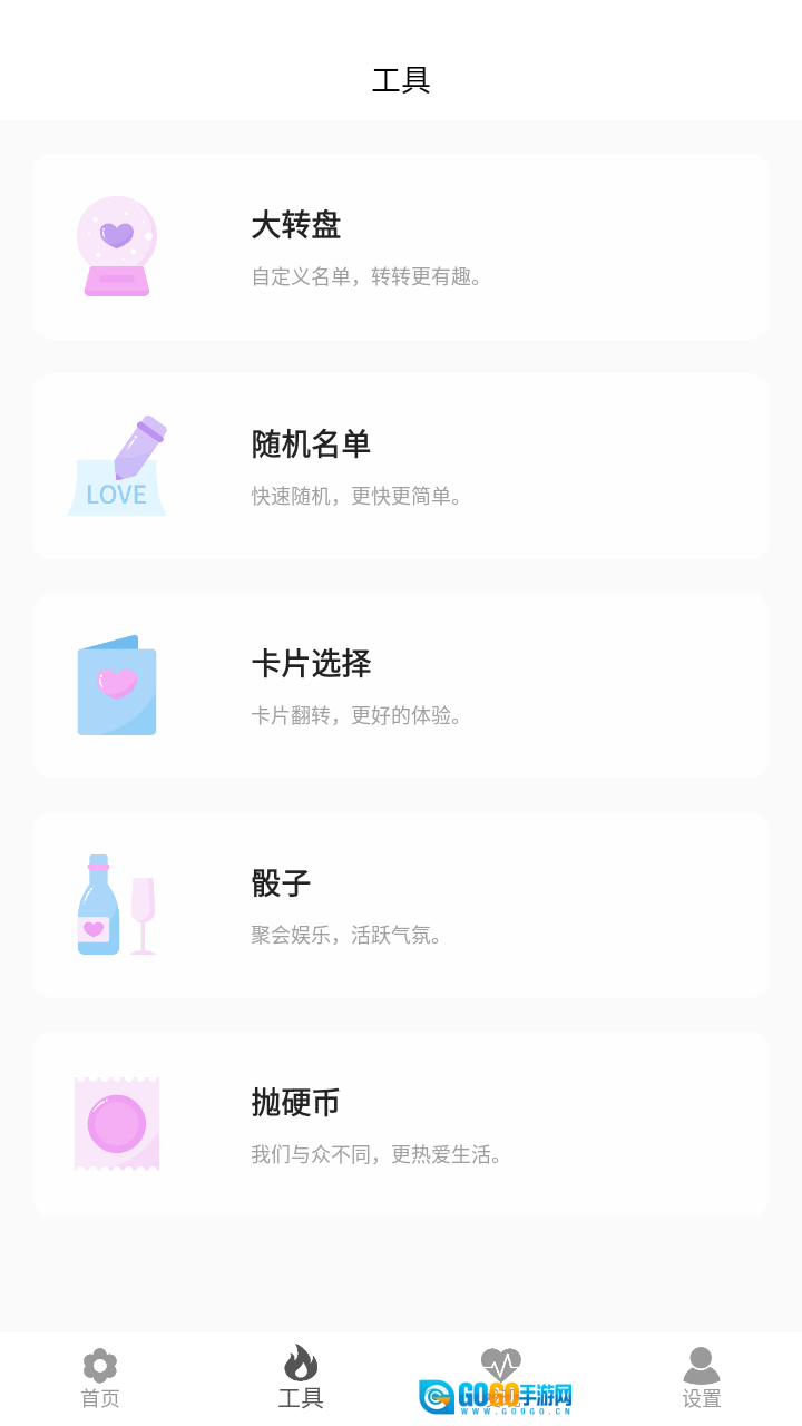 真心话大冒险大全是一款趣味十足的工具类软件,了海量真心话大冒险玩法。玩家只需轻点屏幕,就能轻松获取各类玩法,无论情侣互动还是聚会娱乐,都能找到适配的内容,助力氛围迅速升温。此外,软件还配备了大转盘、随机名单生成、卡片选择、骰子、抛硬币等多样实用小工具,为解锁更多创意玩法提供支持。