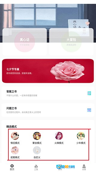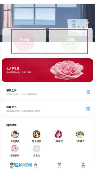 1、打开应用,首页可以选择真心话或者大冒险选项。
